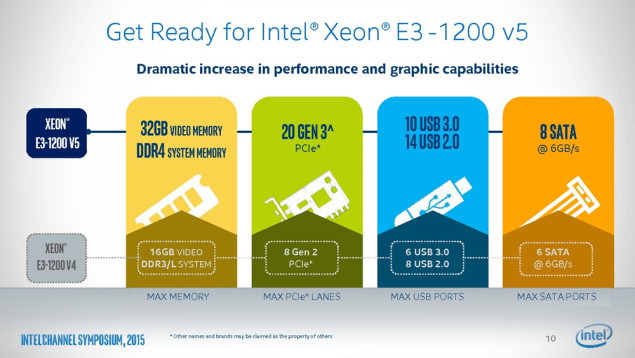 - Xeon E3-1585 V5: quad core, clocks TBD, multi-threaded, 8MB of L3 cache, 65W TDP.