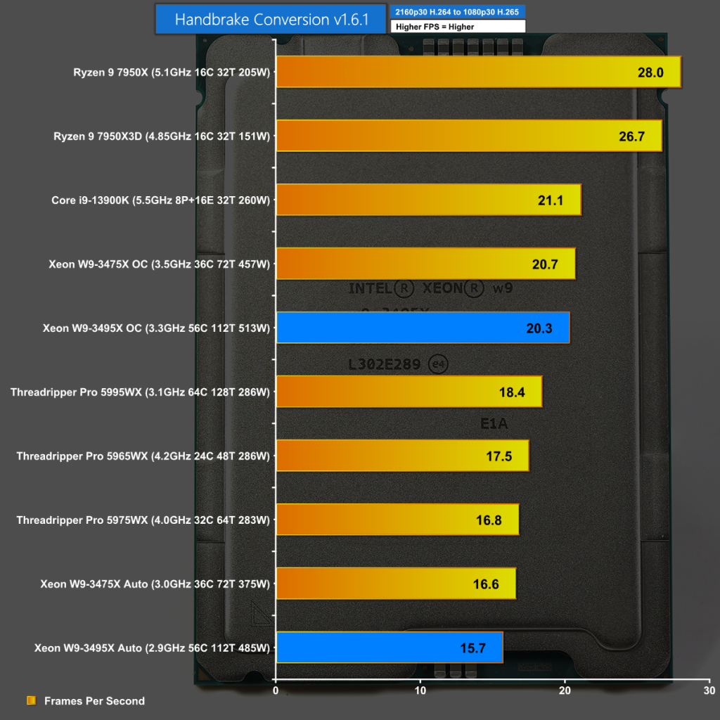 Handbrake H.265 conversion is also curious as it appears to reward a combination of cache and clock speed, with the consequence that the Xeons on Auto look rather poor.