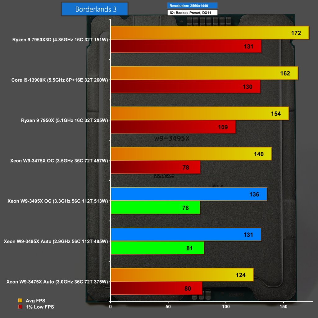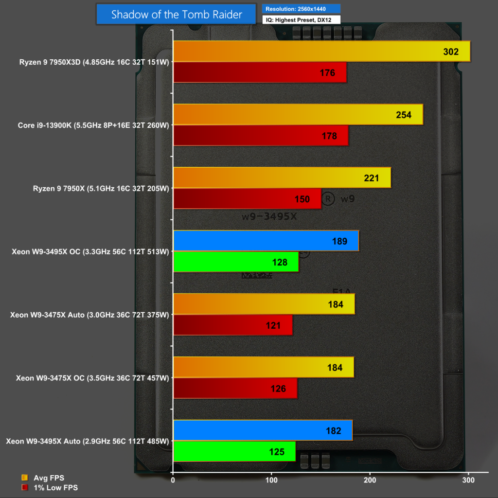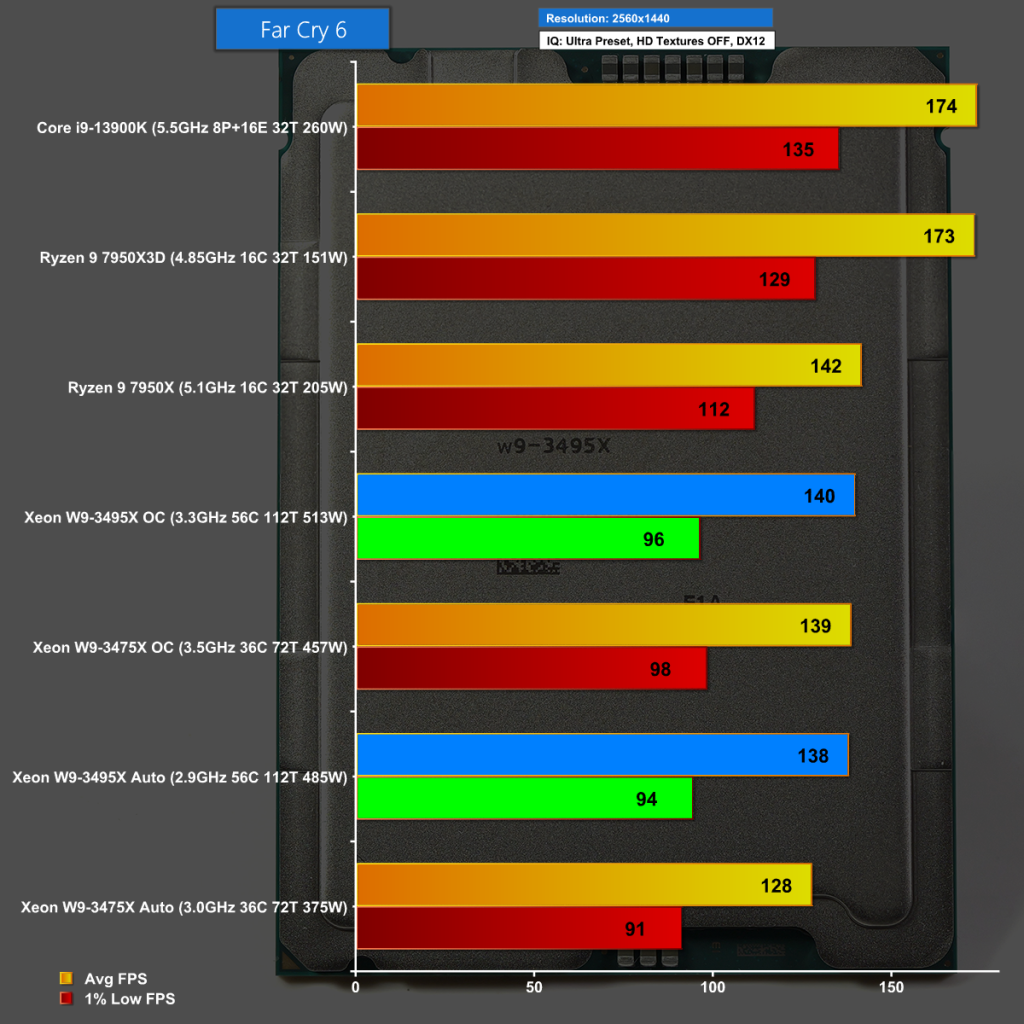 In Far Cry 6 at 1440p we unexpectedly see the Xeon W9-3495X fighting hard with the AMD Ryzen 9 7950X. It seems you can indeed combine work and play.
