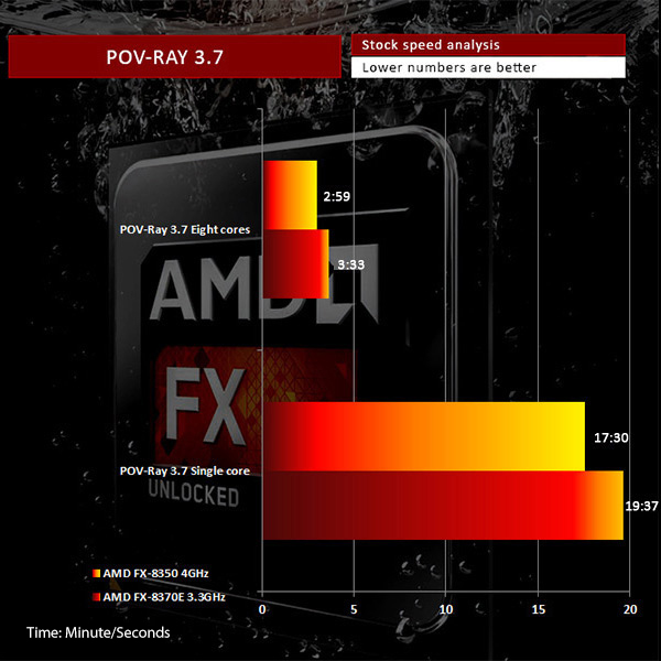 Pov Ray hammers the CPU as it renders an image. It was obvious this would show the FX-8370E in a poor light however POV-Ray has the handy feature that it can run on a single CPU thread as an alternative to running on all available threads.