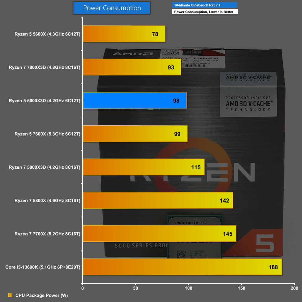 Power Consumption for the Ryzen 5 5600X3D is surprisingly high in Cinebench R23 and comes in 20W higher than the regular Ryzen 5 5600X. It is hard to believe that 96MB of cache requires so much power, which leads us to believe the silicon in this CPU is of questionable quality.