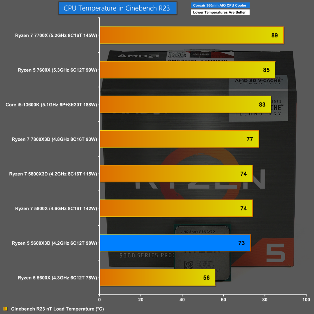 We use a 360mm Corsair AIO on our test bench that has no difficulty keeping the Ryzen 5 5600X and 5600X3D under control, however it is interesting to note the difference in temperature between these two CPUs.