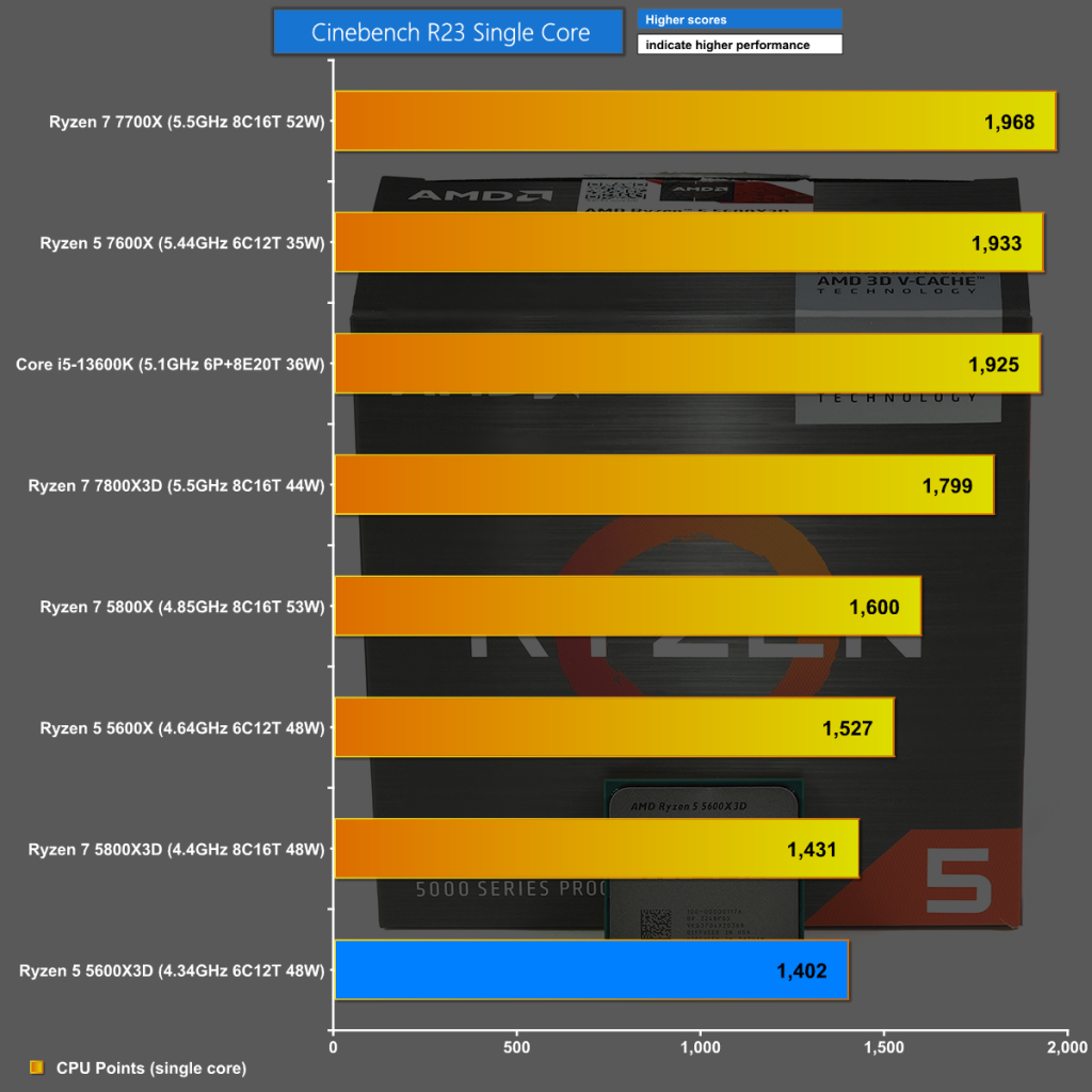 In Cinebench R23 Single Core the Ryzen 5 5600X3D chugs along at 4.34GHz down at the bottom of our chart.