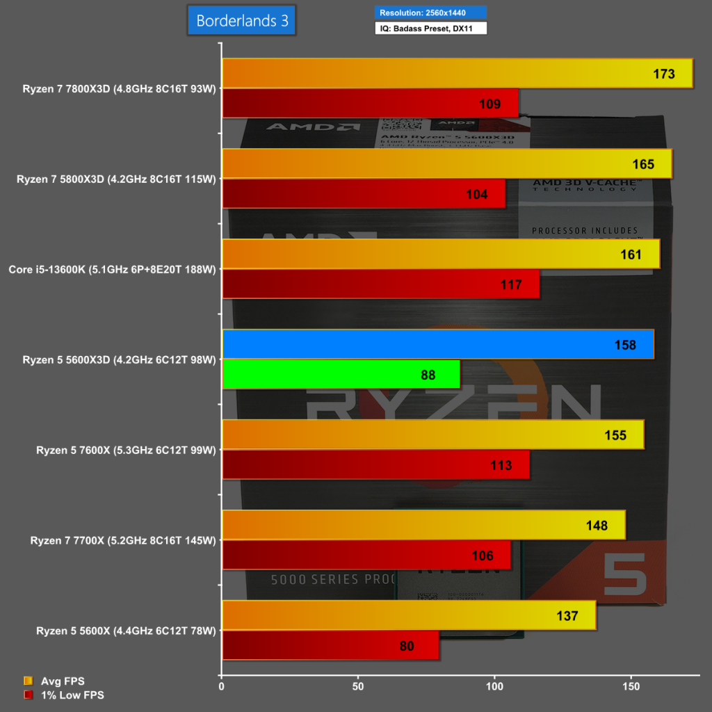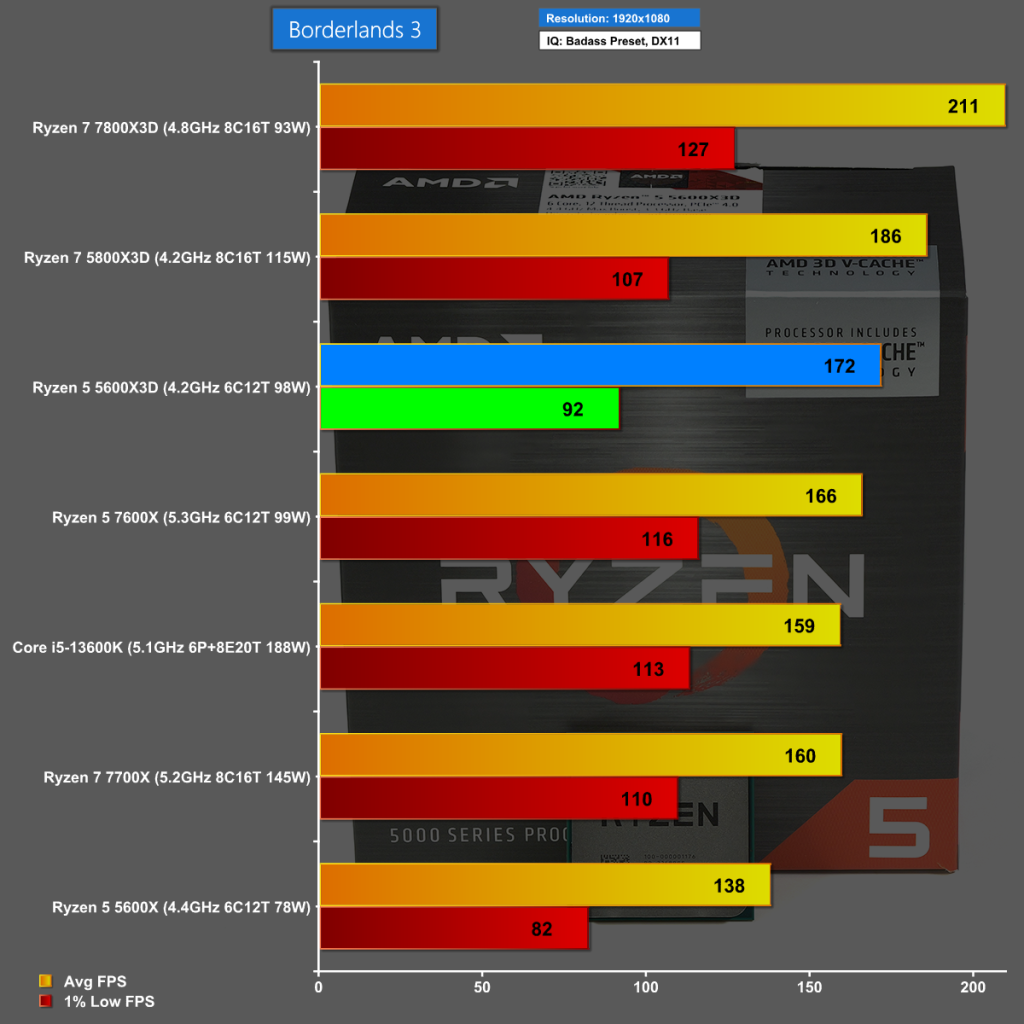 Borderlands 3 at 1080p also shows the Ryzen 5 5600X3D performing well with a delta of 34fps over the regular 5600X.