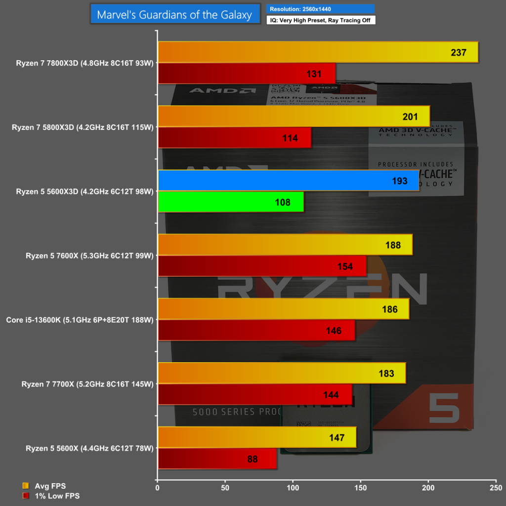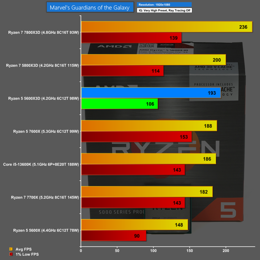 And in Marvel's Guardians of the Galaxy at 1080p we see the same stellar result from the Ryzen 5 5600X3D so you might just as well play in 1440p.