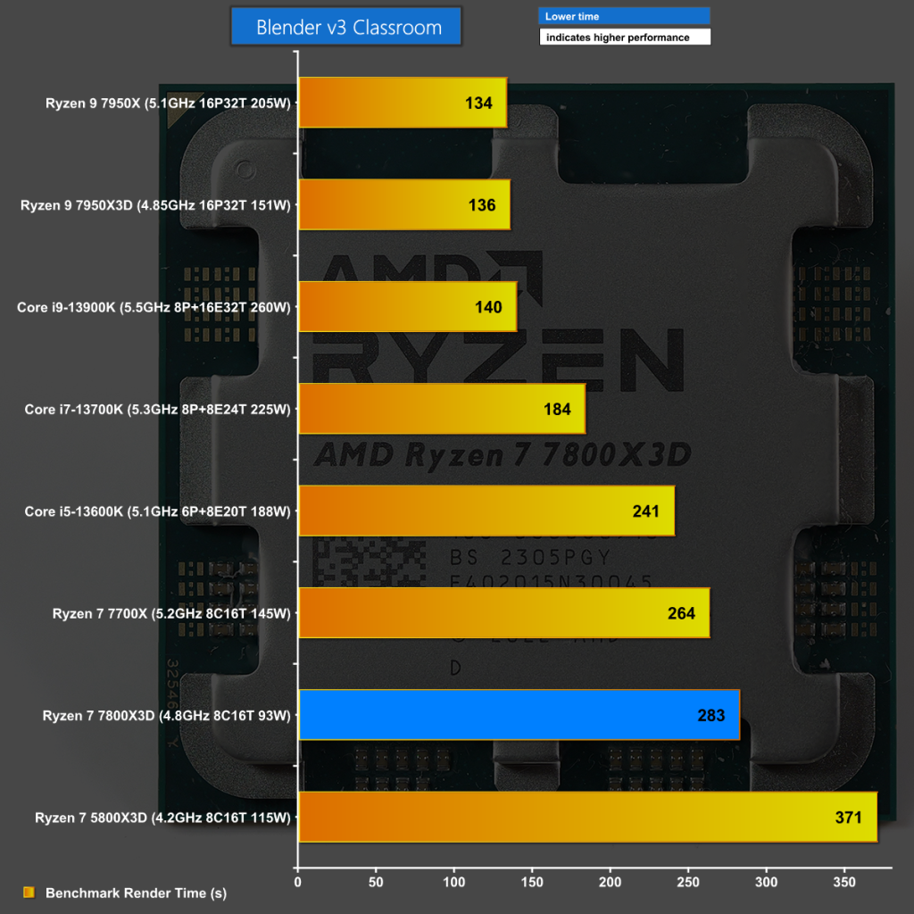 Blender v3 Classroom is another test that pounds the CPU and once again we see results that are perfectly Ok without being anything special.