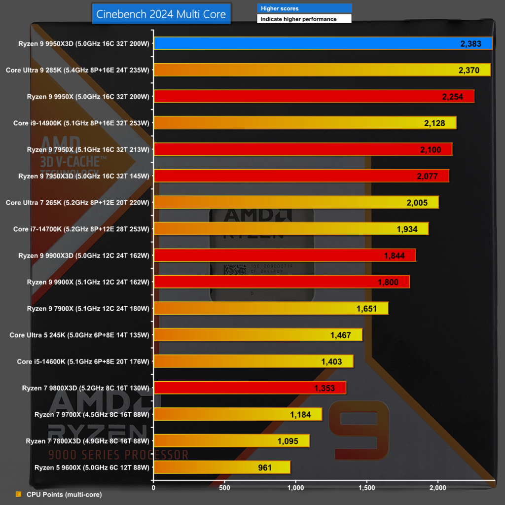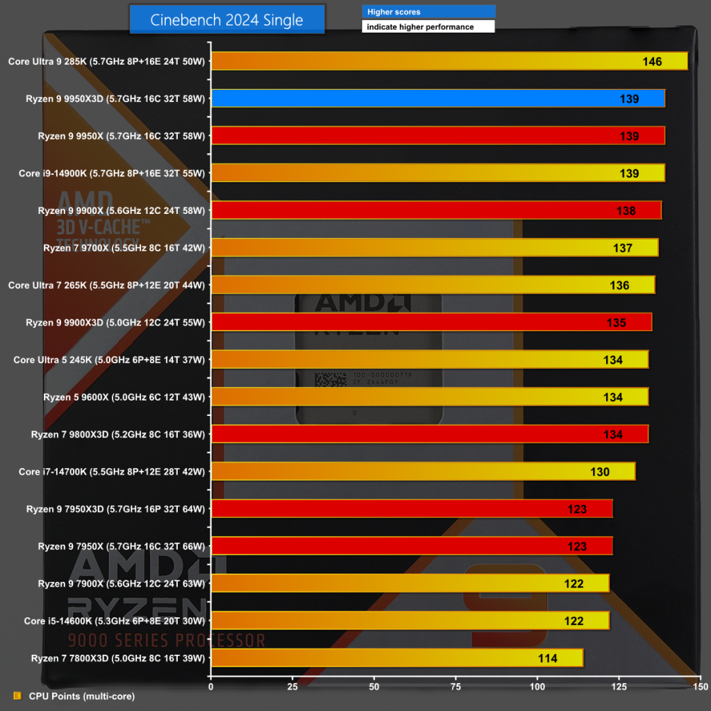 In Cinebench 2024 Multi Core we see the first of many fine results for Ryzen 9 9950X3D, but it should be noted it is only a tiny margin ahead of the Intel Core Ultra 9 285K in this test .