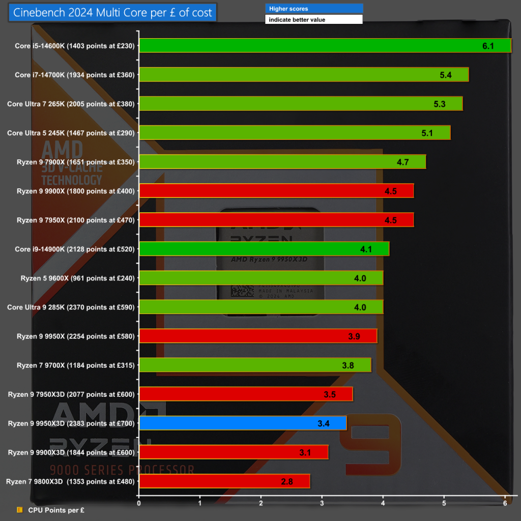 In this chart we take the Cinebench 2024 Multi Core score and divide by the cost of the CPU to get a feel for value for money. AMD 3D CPUs cost plenty and as a result suffer in this chart.