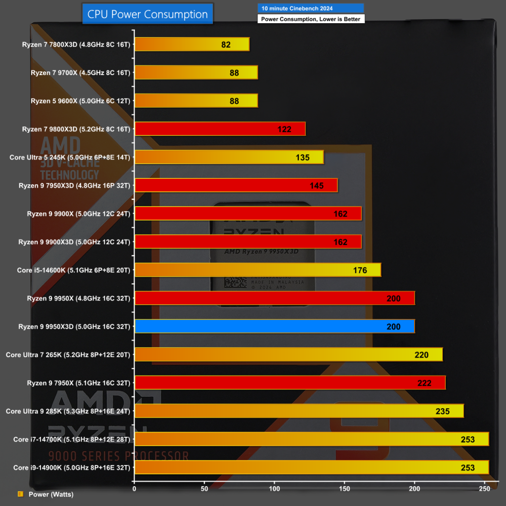 AMD Zen 5 technology is impressively efficient and in this chart of CPU Power Consumption we see that Ryzen 9 9950X and 9950X3D each consume 200W under full load where Intel Raptor Lake demands 253W.