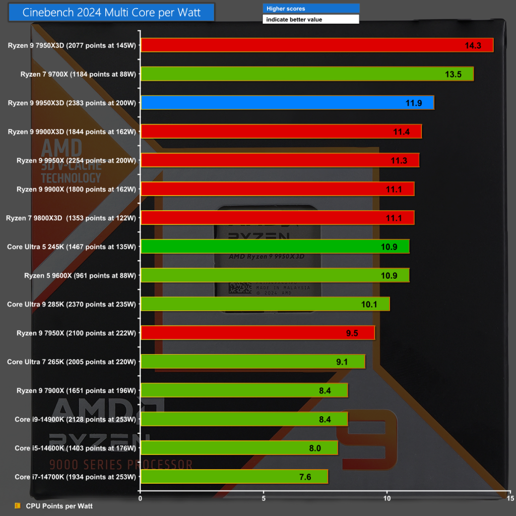 Here we take the Cinebench 2024 Multi Core score and divide by power consumption to gauge efficiency and we see AMD doing well with the Ryzen 9 9950X3D in third place.