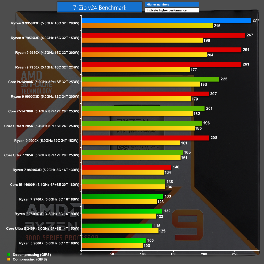 The 7-Zip benchmark is a clear win for the 9950X3D and in second place we see the Zen 4 7950X3D.