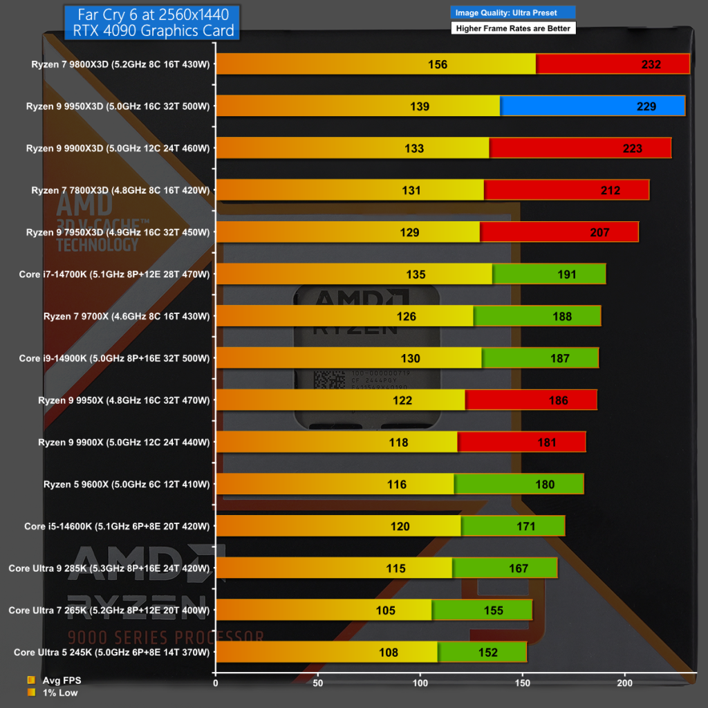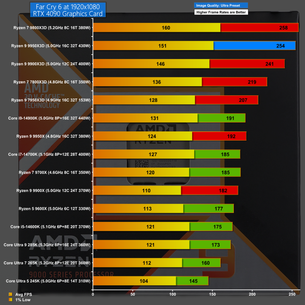 In Far Cry 6 at 1080p the 8-core Ryzen 7 9800X3D wins by a narrow margin over the Ryzen 9 9950X3D.
