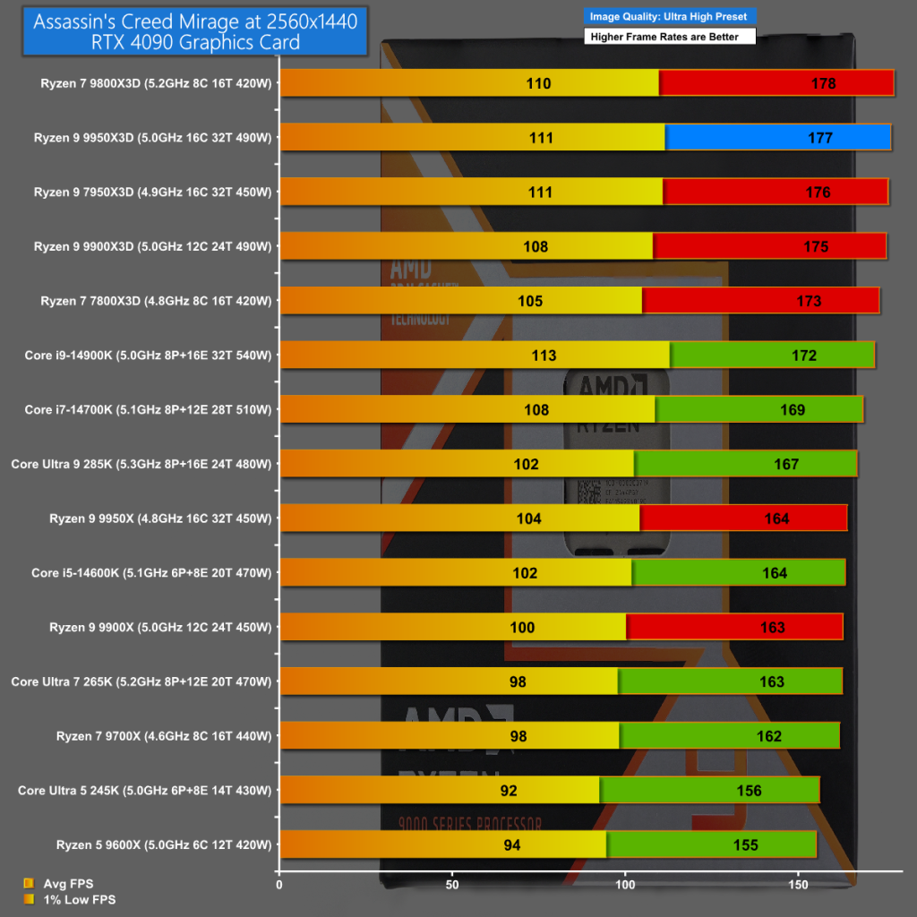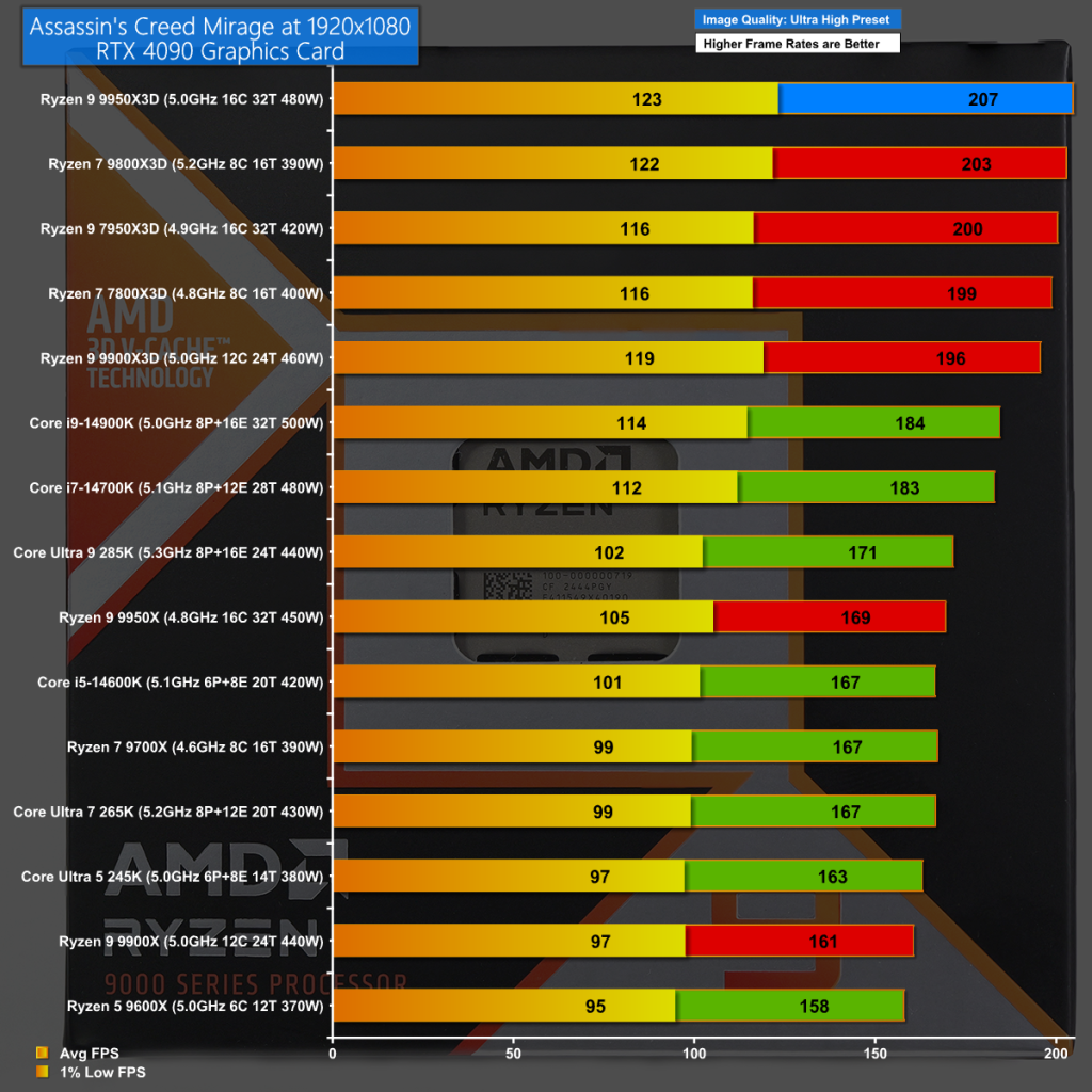 Assassin's Creed Mirage at 1080p gives the win to the 9950X3D over 9800X3D, however there is very little to separate the two CPUs.