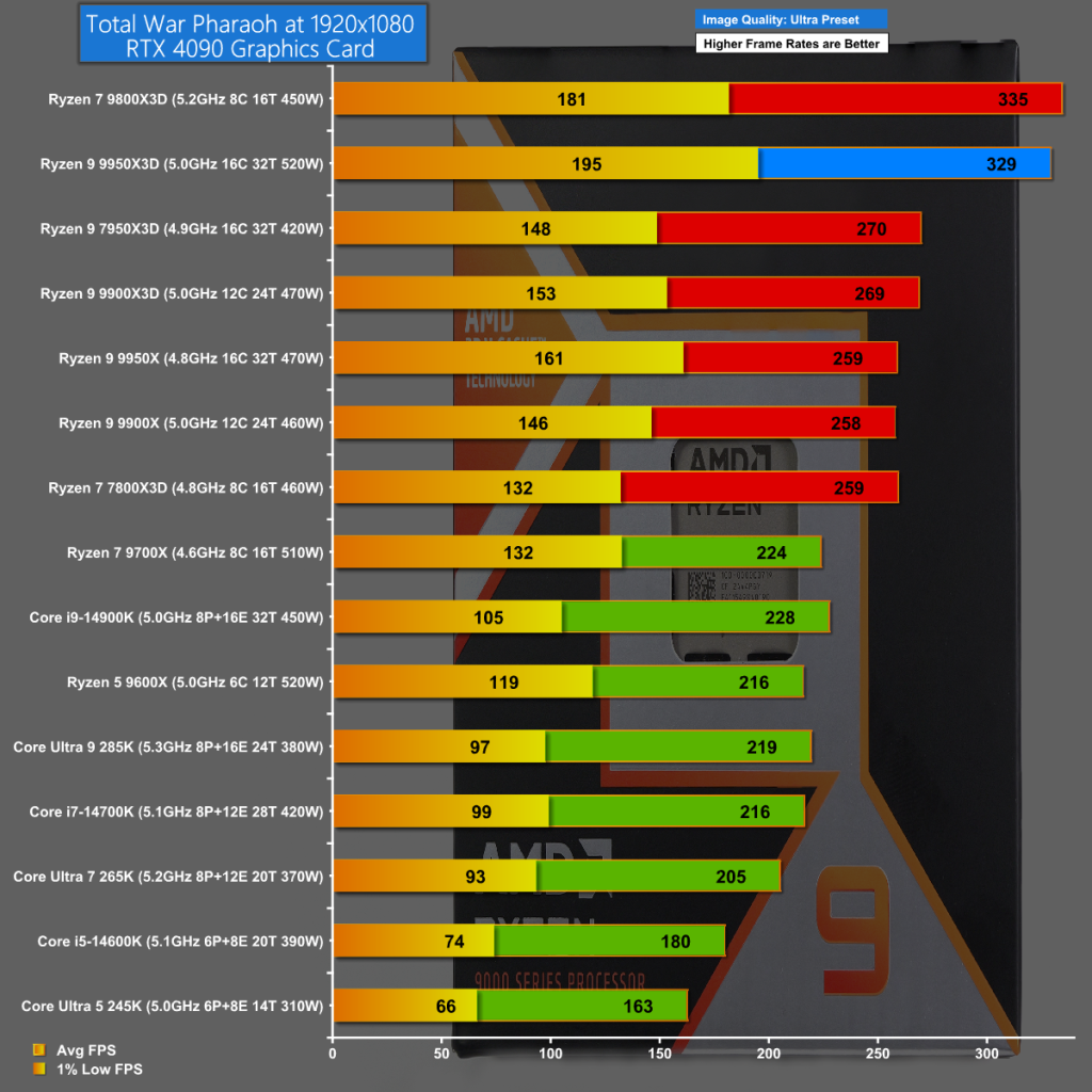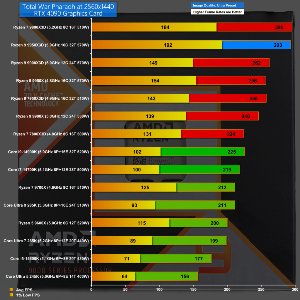 In Total War Pharaoh at 1440p we see another clear victory for the Ryzen 7 9800X3D with Ryzen 9 9950X3D taking another valiant second place.