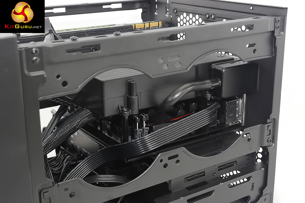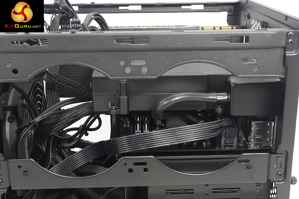 Naturally we plumped for a 240mm H100i to cool our Core i7-6700K and as you will see in our video this required us to remove the optical drive bay, the front intake fan and the exhaust fan at the side. Installing the H100i isn't difficult, although it was very tight for space beside the motherboard where the package of radiator and fans filled every spare millimetre.