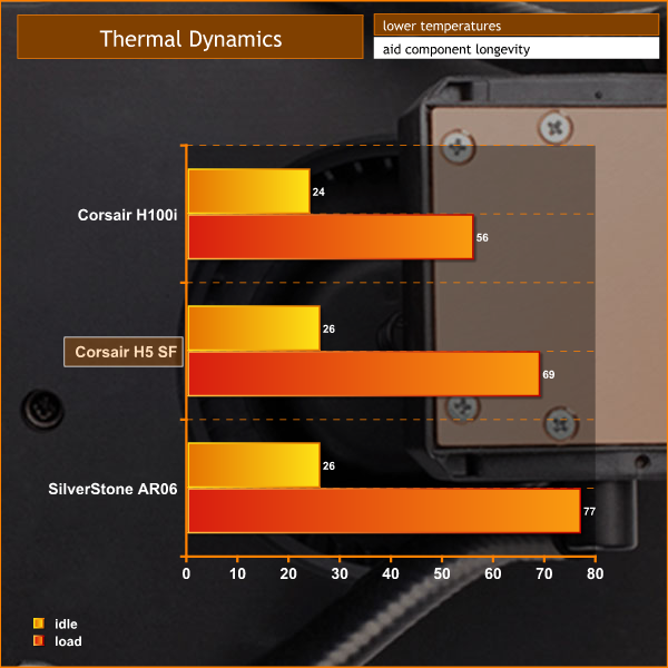 Switching to the Corsair H5 SF cooler gave us a CPU temperature of 69 degrees which is 13 degrees higher than H100i and which seems about right, considering the much smaller size of the cooling hardware.