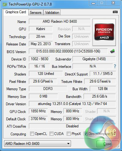 The Gigabyte J1900N-D3V is a bit of an oddball but I had the perfect motherboard for comparison in the form of a Gigabyte AM1M-S2H. This Socket AM1 motherboard sells for £24 and the matching Athlon 5350 APU costs £41.50 so the price of motherboard and APU is almost identical to the J1900N-D3V.