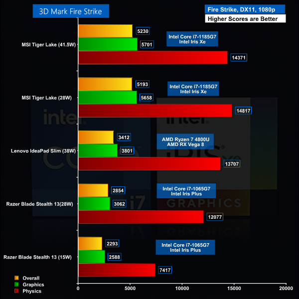 Our 3D Mark Fire Strike chart clearly shows the 96 Execution Units in Intel iris Xe do a fine job while the elderly Vega 8 GPU in Ryzen 7 4800U is somewhat less inspiring. We fully expected that Intel Iris Plus with 64 EUs would sit at the bottom of the chart but we also anticipated that AMD would beat them comprehensively when in fact the margin is quite tight. Tiger Lake looks impressive!