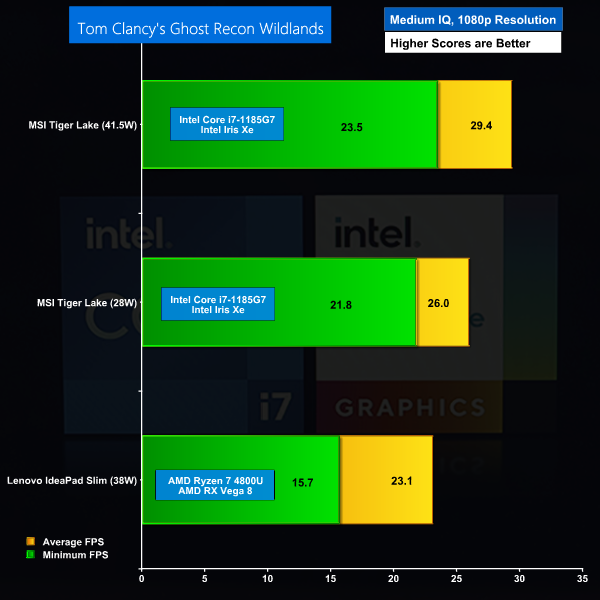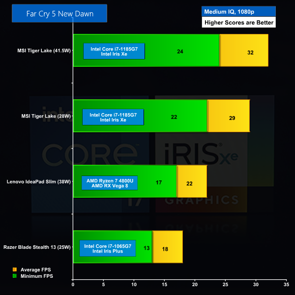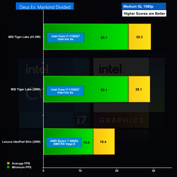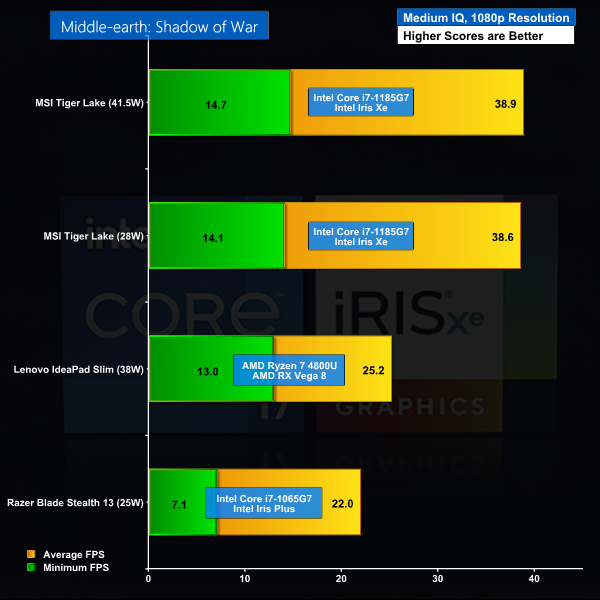 And then we have charts for four games in quick succession, all using 1,920×1,080 resolution and Medium Image Quality. The takeaway is clear as Tiger Lake can play these at 30fps or slightly higher while Ryzen 7 tends to be closer to 20fps. It is safe to say that Tiger Lake should be able to deliver a pleasant gaming experience at 1080p on battery, and while that is impressive it is also a reasonable expectation that GeForce MX450 will perform even better.