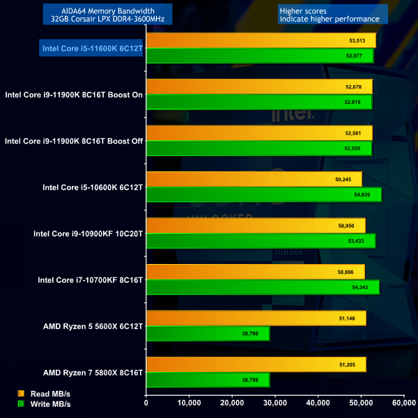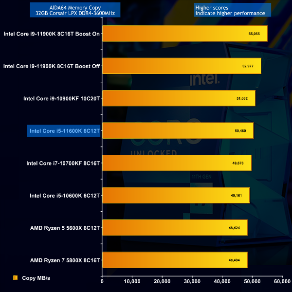 In Blender we see Core i5-11600K once again beat Core i5-10600K however the AIDA64 memory tests are more interesting. Just look at the way that Rocket Lake leaps up the charts in an impressive manner.