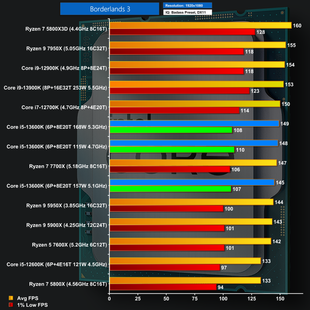 Borderlands 3 at 1080p runs very nicely on the Core i5-13600K, regardless of the power settings.