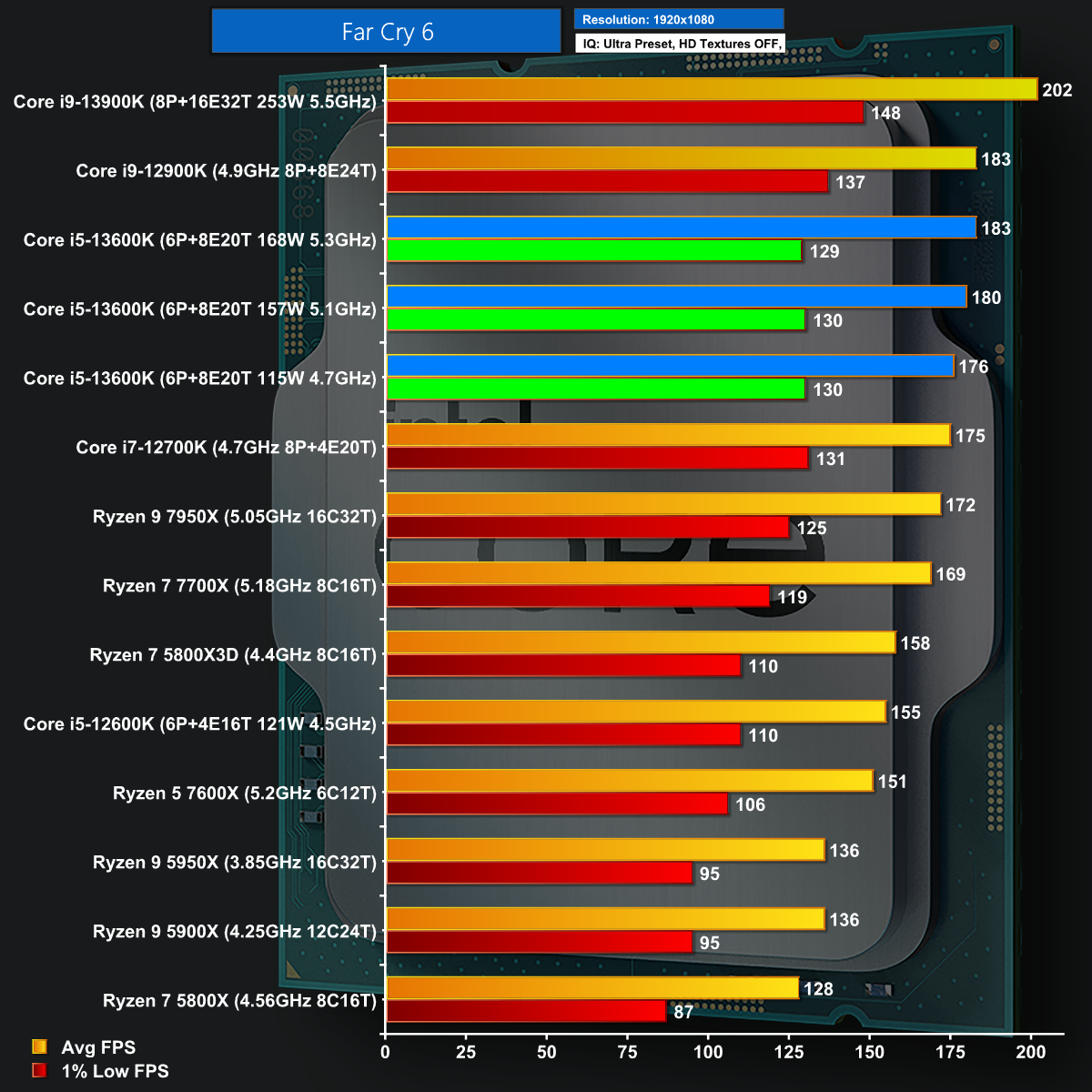 In Far Cry 6 at 1080p we see a small improvement in the frame rates as clock speeds increase but even at 115W this CPU flies along.