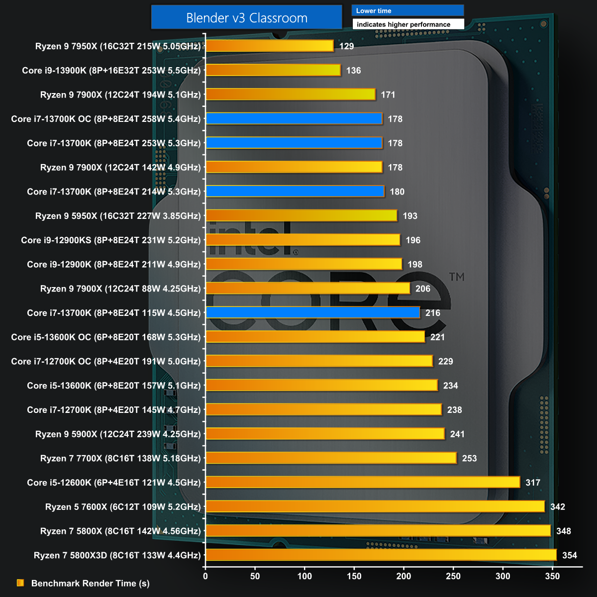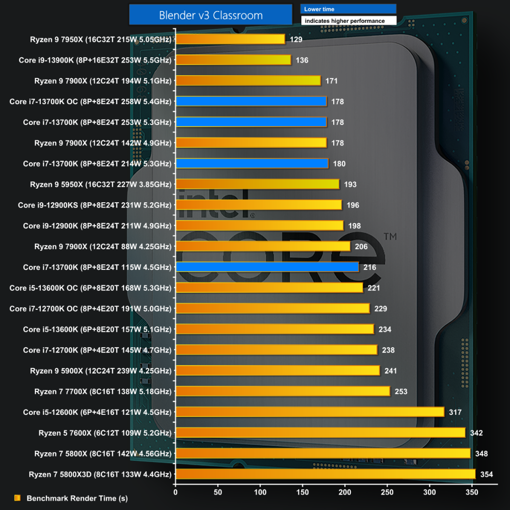 The Blender Classroom render test shows the Core i7 performs in the same league as the Ryzen 9 7900X. We also see the Core i7 can happily run on 214W while delivering almost identical performance to the Auto 253W setting.