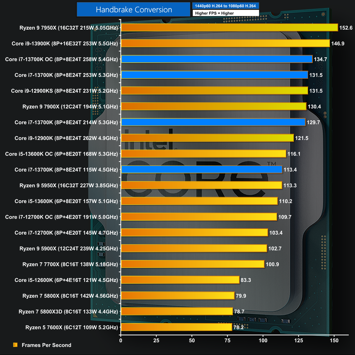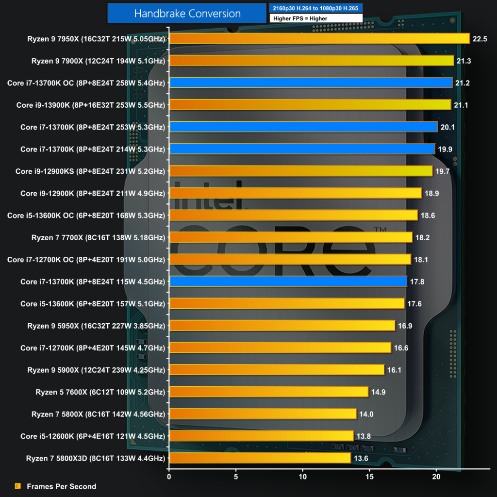 In Handbrake H.265 Conversion the frame rates are incredibly close and while the Core i7 does well it is beaten by the Ryzen 9 7900X, albeit by a tiny margin.