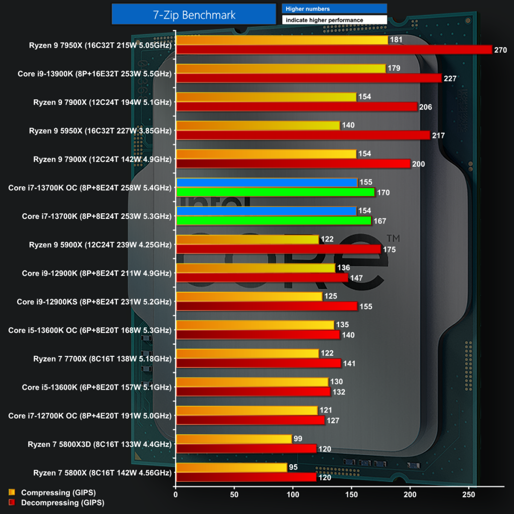 7-Zip is a test of pure CPU grunt and we see the Core i7-13700K slip down the chart below the older Ryzen 9 5950X. Even so, performance is very good.