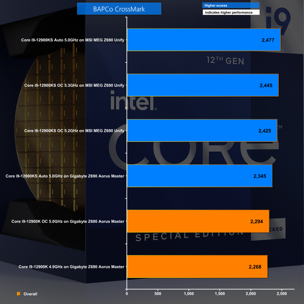 BAPCo CrossMark is interesting as the KS on Auto settings tops the chart by a small margin which suggests the bursty increase in clock speeds delivers better results than a fixed speed overclock.