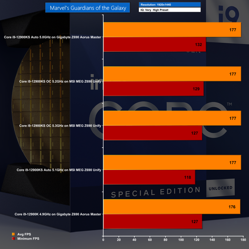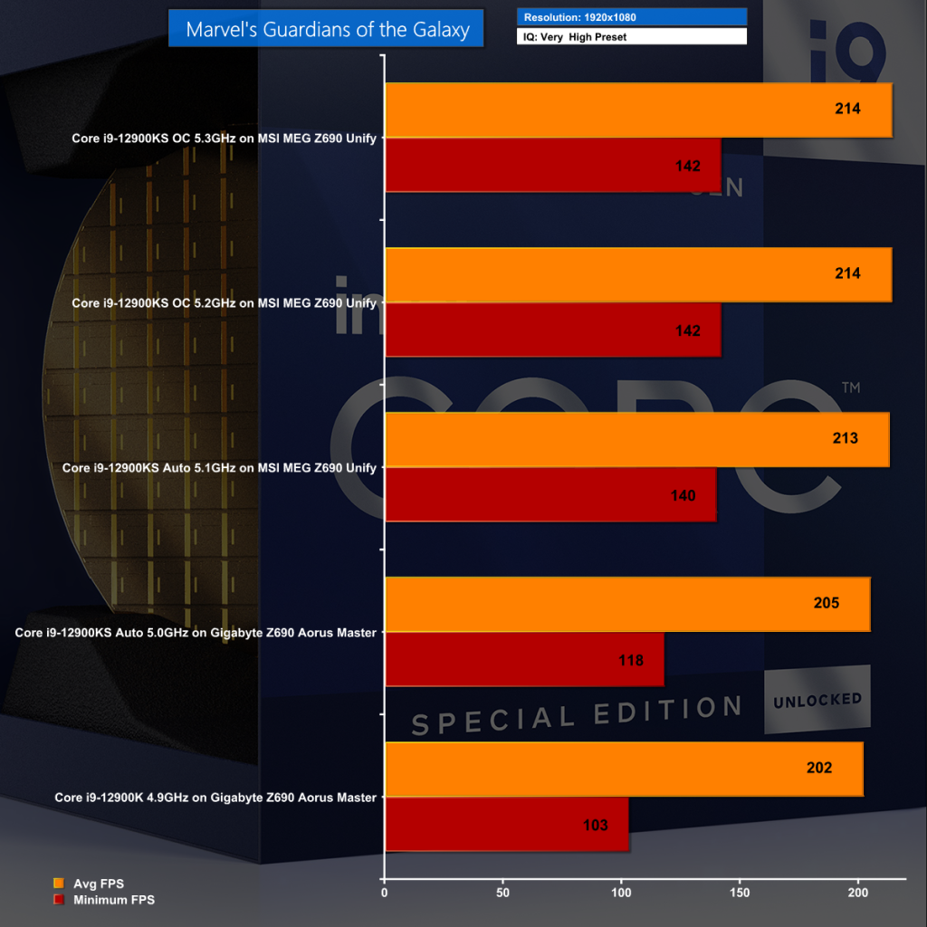 You can see a distinct benefit from the KS in Marvel's Guardians of the Galaxy at 1080p, in particular when you overclock to 5.3GHz.