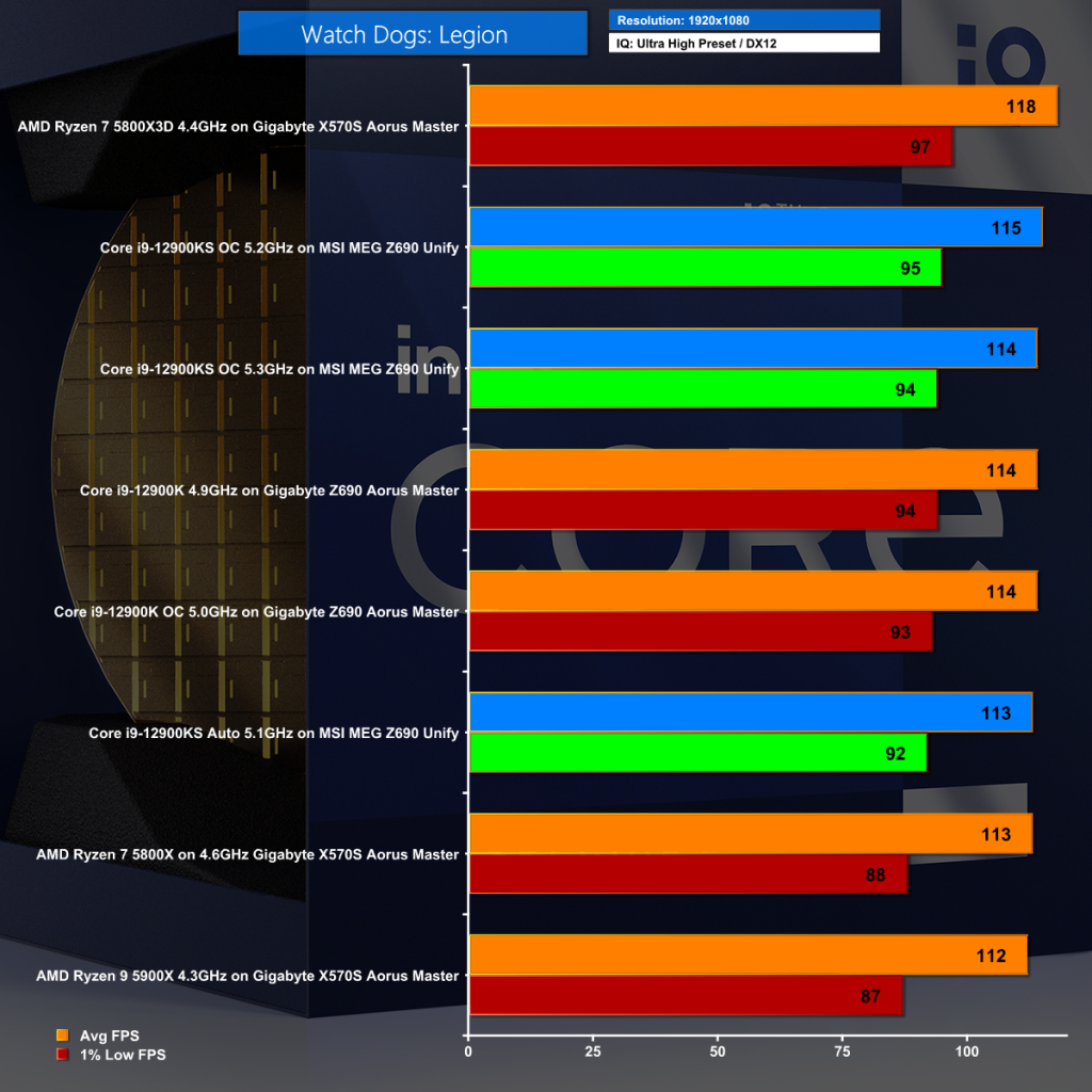 Watch Dogs: Legion at 1440p has the Ryzen 7 5800X at the top of the chart and Core i9-12900K at the bottom. We are only talking about 3fps difference from one end to the other so the fairest conclusion is that any of these CPUs will work quite nicely.