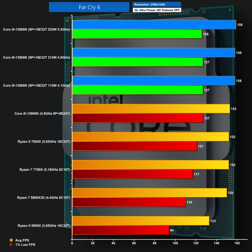 In Far Cry 6 at 1440pThe new Core i9 beats the 12th Gen Core i9 by a small margin.