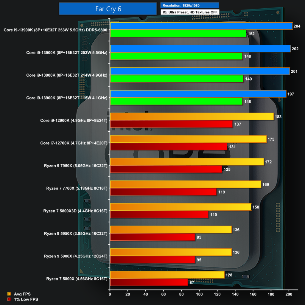 In Far Cry 6 at 1080p we see a decisive victory for Core i9-13900K and the gap increases when we step up to faster DDR5-6800 memory.