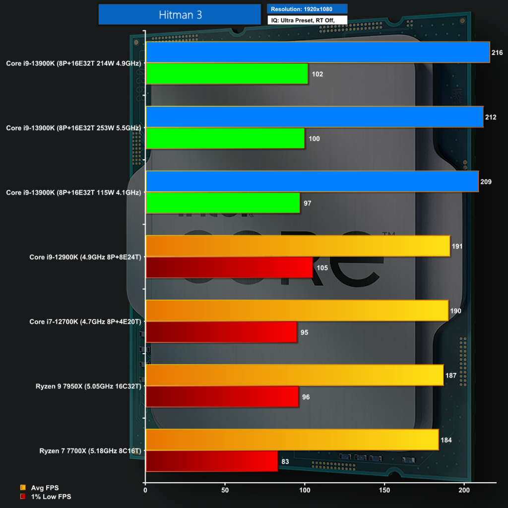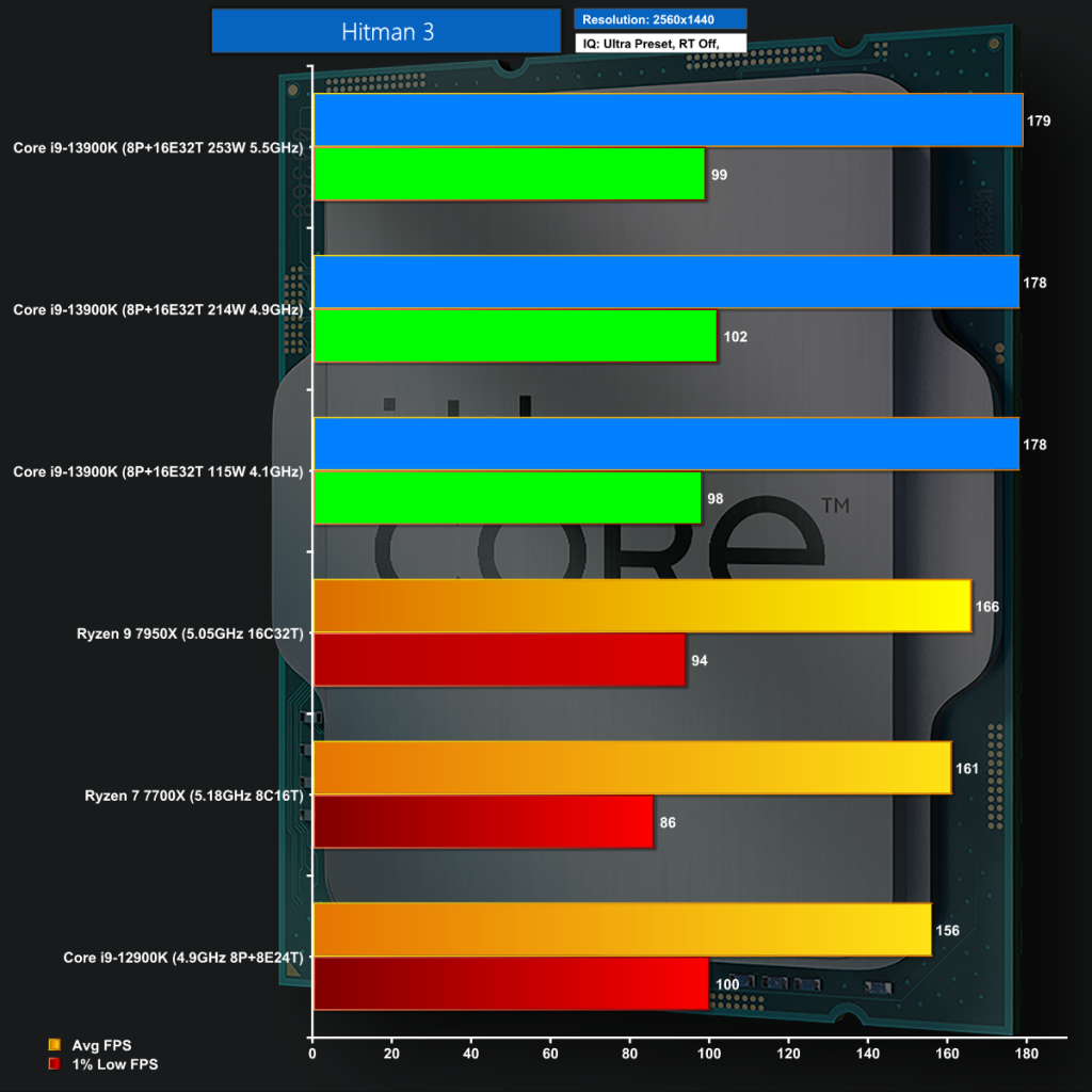 Hitman 3 at 1440p looks great on the new Core i9 and this is true even when CPU power is cut to 115W.