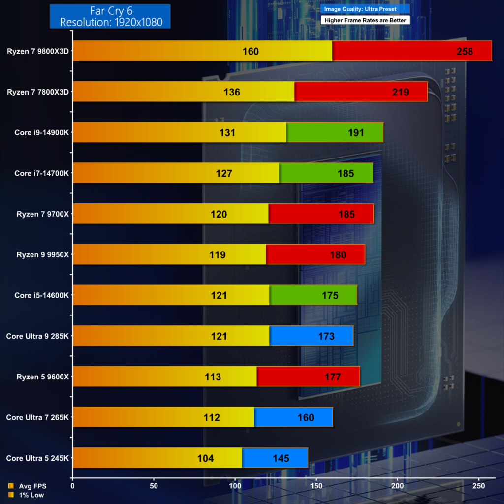 In our first gaming test, Far Cry 6 things start poorly for Core Ultra 200S. The new CPUs are beaten by 14th Gen Raptor Lake and regular AMD Zen 5 CPUs and absolutely crushed by Ryzen 7 3D.