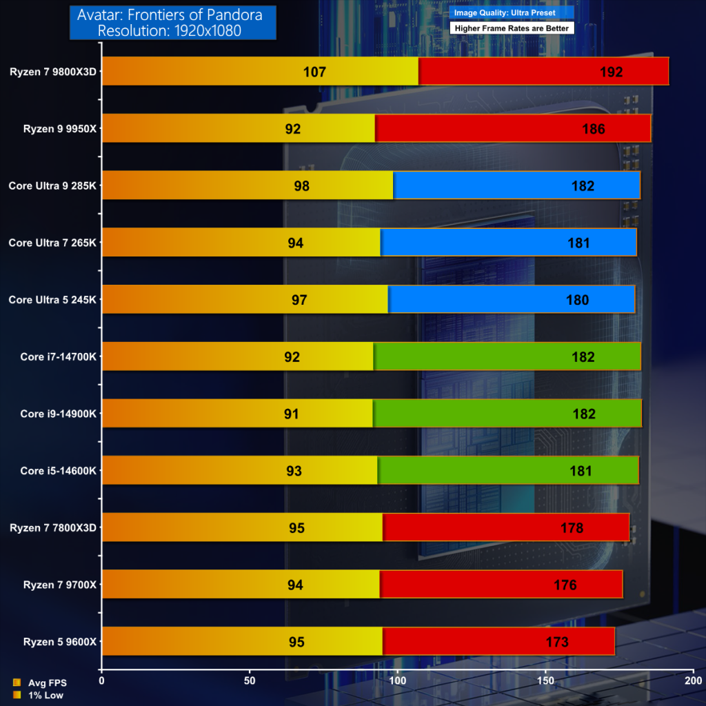 Thankfully in Avatar: Frontiers of Pandora we see signs of improvement for Intel as Core Ultra 200S is in a straight fight with 14th Gen Raptor Lake. We see a small win for Core Ultra 200S in the 1% lows which is likely thanks to the fast DDR5 memory. Nonetheless, AMD takes the top spot with Ryzen 7 9800X3D.