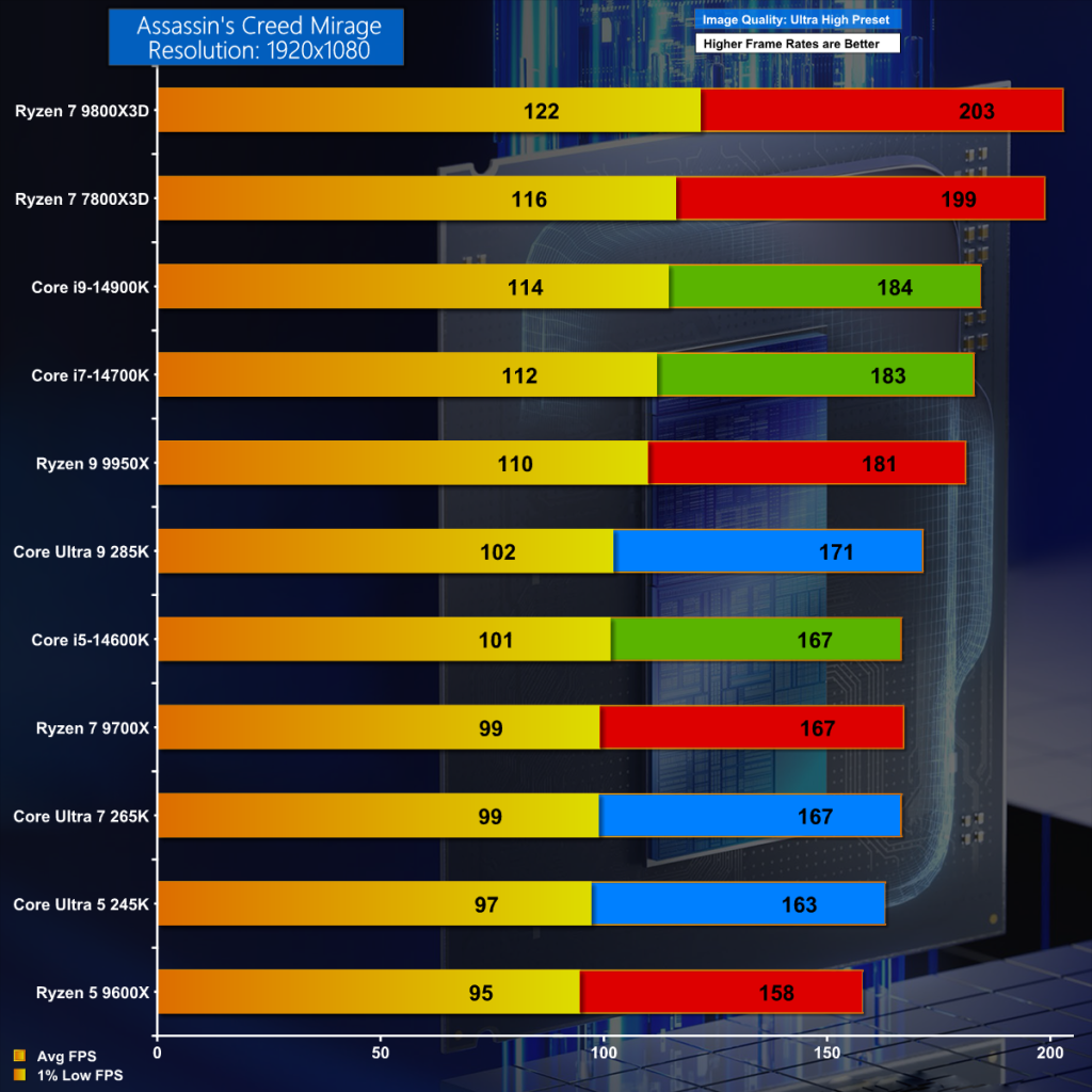 There is a change in fortunes for Core Ultra 200S in Assassin's Creed: MIrage as the new CPUs slump behind Raptor Lake such that Core Ultra 9 285K only narrowly beats Core i5-14600K. Up at the top of the chart we see the AMD Zen 5 and Zen 4 Ryzen 7 3D chips.