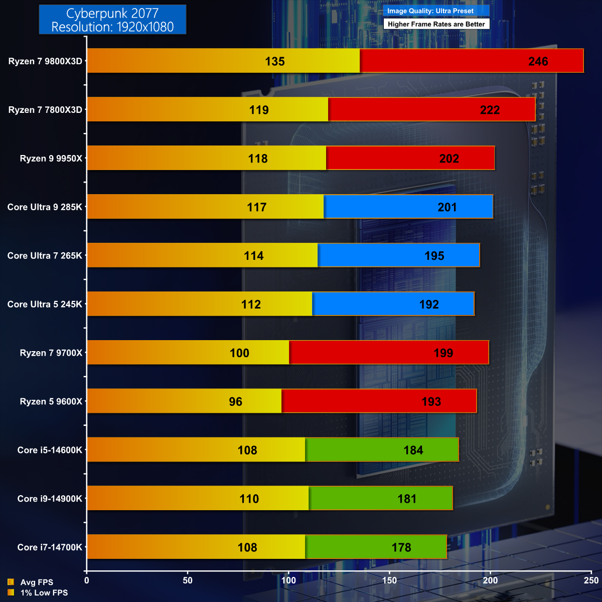 Our chart for Cyberpunk 2077 shows the most grunty AMD CPUs leading the way, however Core Ultra 200S does a decent job with Core Ultra 9 285K effectively in a dead heat with Ryzen 9 9950X. It is interesting to see 14th Gen Raptor Lake falling a distance behind in this game.