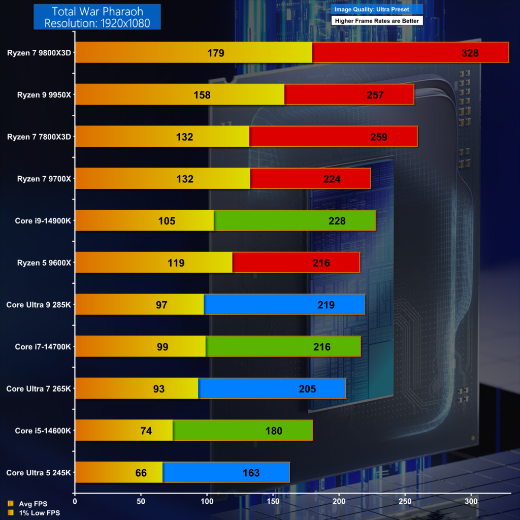 Total War Pharaoh sums up the problems faced by Intel. The king of this particular heap is AMD and then we see 14th Gen Raptor Lake beating Core Ultra 200S. The gap between Ultra 9/Core i9, Ultra 7/Core i7, and Ultra 5/Core i5 is around 10fps which is not huge but also is not what we expect. In any sane and normal world the new CPUs should be better than the older CPUs.