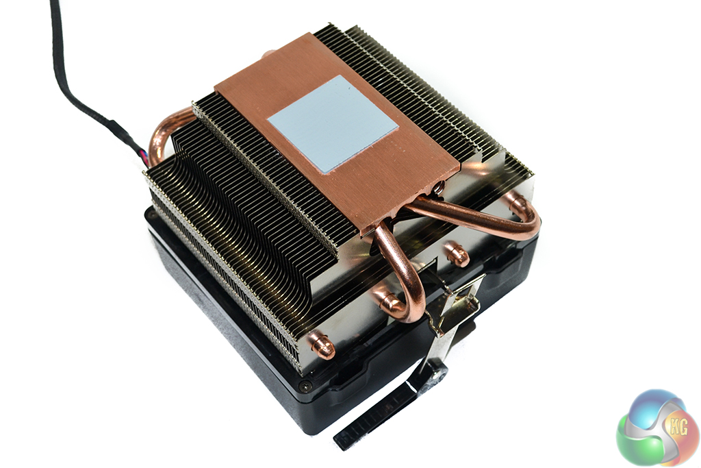 Four copper heatpipes, which seem be of a 6mm-diameter variety, feed directly into a copper base plate. Those heatpipes carry thermal energy away from the CPU to upper sections of the tiered aluminium fin array. A pre-applied square of thermal paste should keep users happy for a single mounting procedure.