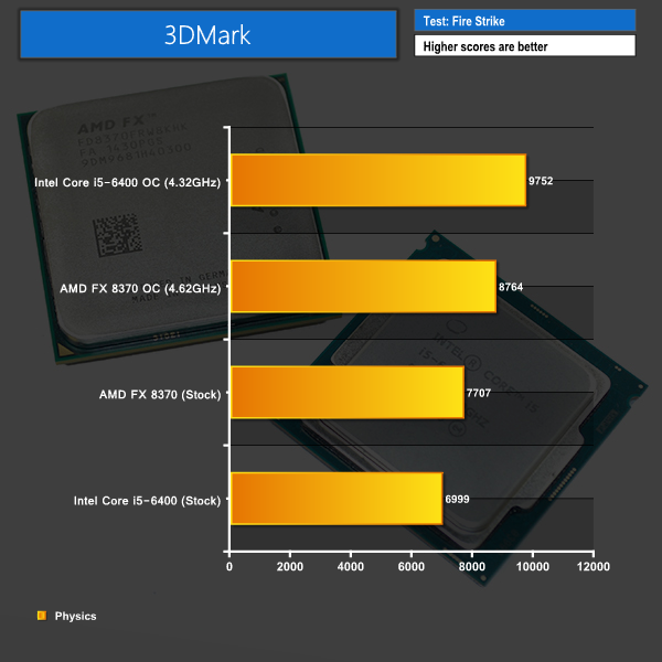 The sheer number of cores on offer by AMD's FX 8370 allows it to outperform the stock-clocked i5-6400 quad core. Turn on the afterburners for Intel's chip and even the overclocked Vishera part simply cannot match the Physics performance of a 4.32GHz Skylake Core i5-6400.