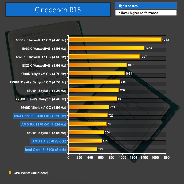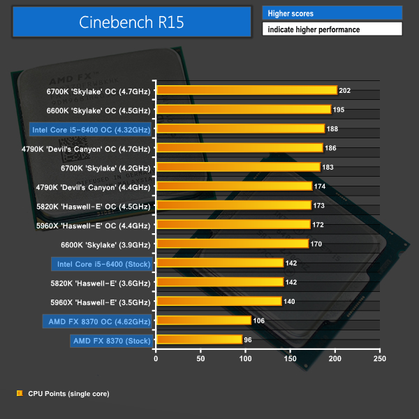 AMD's octa-core chip is able to leverage its multi-threaded design and significantly higher clock speed to comfortably outpace Intel's Core i5-6400 before overclocking. But that's only true for the multi-threaded Cinebench test; single-threaded performance from the Skylake architecture is vastly superior to that of AMD's Piledriver-based cores.