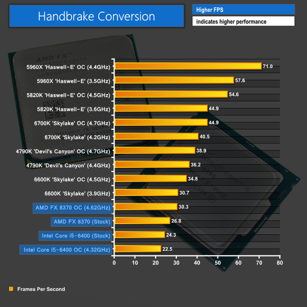 Video conversion is one of the primary drivers for wanting a processor with bags of multi-threaded performance. And that's what is shown from our test data. The 8-core AMD chip is able to outperform the stock-clocked i5-6400, despite its evident IPC disadvantage. When the FX 8370's clock speed is pushed to 4.62GHz, the chip is actually able to compete with a 3.9GHz Core i5-6600K.