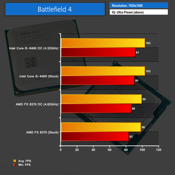 The test results show that either processor is a good choice based on Battlefield 4's campaign levels, however the Intel Core i5-6400 does have a slight edge.