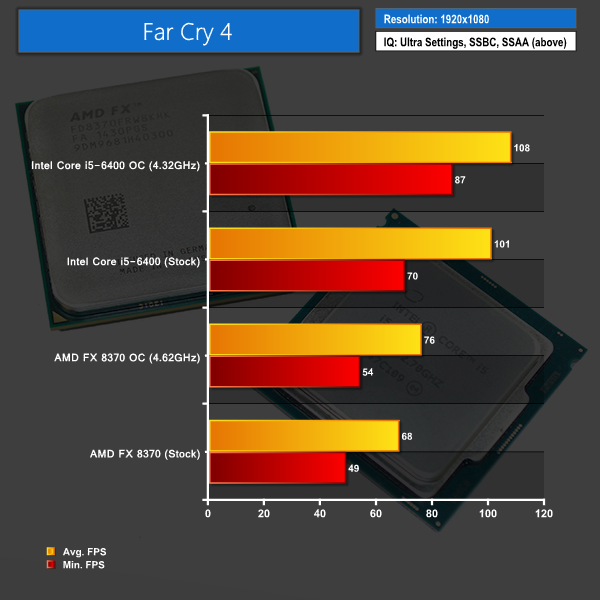 Whether the design of this game's engine dislikes AMD's hardware or if it is better optimised to take advantage of Intel's newer instruction sets is unclear. Either way, our test results show that Intel's Skylake Core i5-6400 is the better choice for gaming with Far Cry 4.