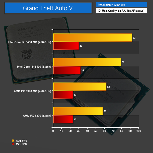 But as is clear from our charted test results (and our internal testing), GTA V also has a clear liking for IPC from the CPU driving the game. Despite being pinned at 90+% CPU usage, to the point that the GTX 980 Ti is being bottlenecked, Intel's stock-clocked Core i5-6400 still comes out with a clear frame rate advantage over AMD's 8-core chip. The gap widens when the i5's clock speed is increased.