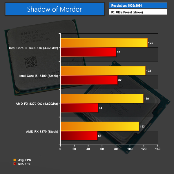 Middle Earth: Shadow of Mordor places the performance onus clearly on the graphics card. The built-in benchmark has very few areas where CPU performance is really stressed. And the game engine doesn't balance the load between CPU cores, either; Intel's chip will have a single core pinned at significantly higher utilisation, while many (usually 3 or 4 out of 8) of the threads on AMD's part will be left idling.