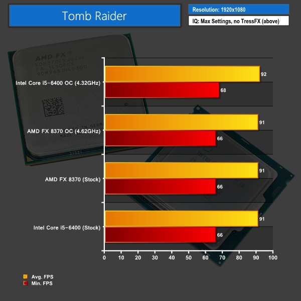 Any of the CPU configurations shown in the above chart offer enough performance to max-out the Tomb Raider benchmark with a GTX 980 Ti. This is good news to gamers whose favourite AAA titles may have launched a few years ago, as CPU performance from either of these chips is unlikely to be a limiting factor.