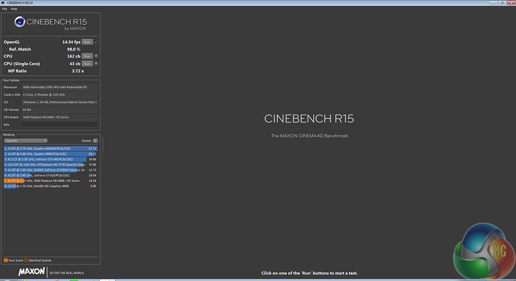 The 2.05GHz quad-core Athlon 5350 APU delivers a respectable score in the Cinebench R15 CPU test. AMD indicated that Kabini's ‘Jaguar' cores are about 50% of the size of the ‘Steamroller' versions used in the company's Kaveri APU.